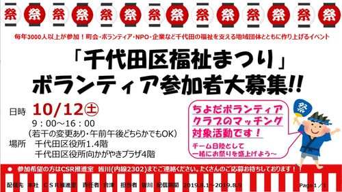 こんにちは、CSR担当のミナコです。 10月12日(土)に千代田区役所で開催される千代田区福祉まつりに参加します。このイベントには昨年度から参加しており、今年度はコンシェルジュボランティアとして参加いたします。お揃いの日陸Tシャツを着て、このお祭…